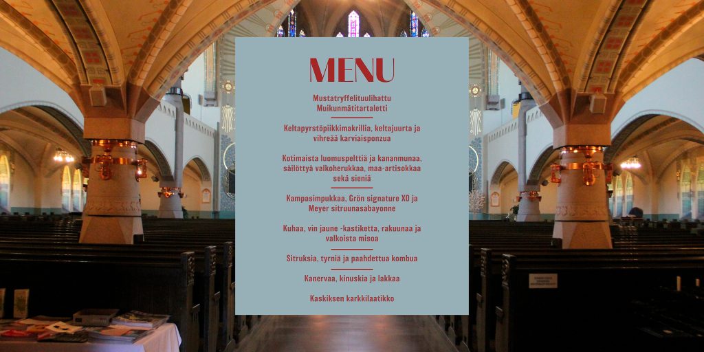 Illallinen Turun Mikaelinkirkossa sisältää kahdeksan ruokalajia ja maksaa lähes 200 euroa